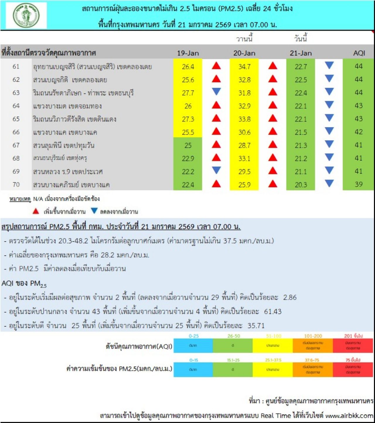 วันที่ 21 ม.ค. 69 ศูนย์ข้อมูลคุณภาพอากาศกรุงเทพมหานคร รายงานสถานการณ์ฝุ่นละอองขนาดไม่เกิน 2.5 ไมครอน (PM 2.5) ของสถานีตรวจวัดคุณภาพอากาศของกรุงเทพมหานคร เวลา 07.00 น. ค่าเฉลี่ย 24 ชั่วโมง ของฝุ่นละอองขนาดไม่เกิน 2.5 ไมครอน (PM 2.5) ตรวจวัดได้ 20.3-48.2 ไมโครกรัม/ลูกบาศก์เมตร (มคก./ลบ.ม.) พบว่าเกินมาตรฐานอยู่ในระดับสีส้ม เริ่มมีผลกระทบต่อสุขภาพ (มาตรฐานไม่เกิน 37.5 มคก./ลบ.ม.) จำนวน 2 พื้นที่ คือ