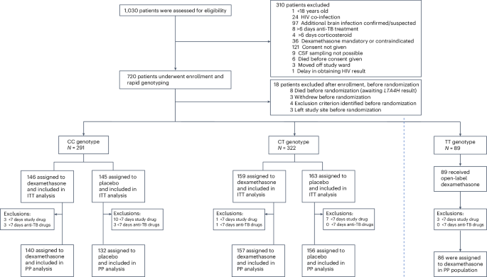 The analysis followed a prespecified and published plan28. The data were analyzed using the program R (version 4.4.2; R Core Team, 2024)37. In brief, intention-to-treat and per-protocol analyses were performed for the primary and secondary endpoints. The intention-to-treat analysis included all randomized CC- and CT-genotype participants, even if no study drug was received after randomization. The per-protocol analysis included all randomized participants, excluding those subsequently found to have not met all inclusion criteria or to have met any exclusion criteria and participants with a final diagnosis other than tuberculous meningitis. We also excluded participants who received