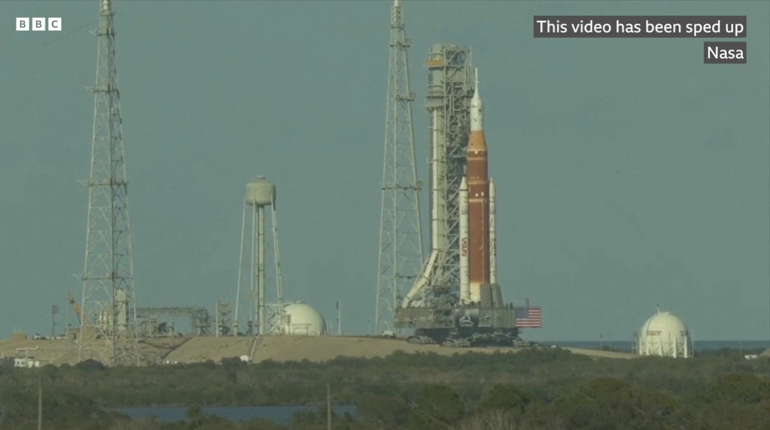 Roket Space Launch System berwarna oranye dan putih yang sangat besar beserta wahana Orion perlahan-lahan digerakkan keluar dari Gedung Perakitan Kendaraan di Pusat Luar Angkasa Kennedy di Florida, dan dengan susah payah dipindahkan sejauh empat mil (6,5 kilometer) ke Landasan Peluncuran 39B di Cape Canaveral, Florida.
