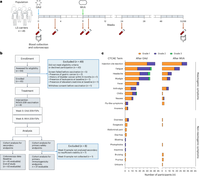The trial was a phase 1b/2 single-arm, open-label, multicenter, prospective study originally designed with the coprimary endpoints of safety and immunogenicity following initial vaccination with Nous-209 monotherapy. To achieve a goal of at least 36 individuals evaluable for the primary immunogenicity endpoint, up to 45 participants were enrolled between November 2022 and November 2023 at four institutions (The University of Texas MD Anderson Cancer Center (MDACC), The University of Puerto Rico, Fox Chase Cancer Center and City of Hope) within the National Cancer Institute (NCI) iCAN PREVENT clinical trial consortium. At baseline, all participants underwent standard-of-care screening lower endoscopy (flexible sigmoidoscopy or colonoscopy). Confirmed eligible participants received initial Nous-209 vaccination as a single 1-ml IM injection of GAd20-209-FSPs (nominal concentration of 2 × 1011 viral particles per ml) at week 0 (prime), followed by a single 1-ml IM injection of MVA-209-FSPs (nominal concentration of 2 × 108 infectious units per ml) at week 8 (boost).